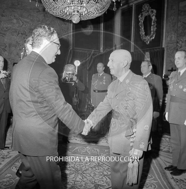 El Secretario de Estado de Exteriores Mr. Henry Kissinger, acompañado del Ministro de AA.EE. españón Sr. López Rodó, es recibido en El Pardo por el Jefe del Estado Francisco Franco.