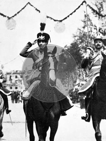 S.M. La reina Victoria Eugenia saluda a caballo al nuevo estandarte del regimiento de su nombre, bordado por la Reina y regalado a la Academia de Caballería.
