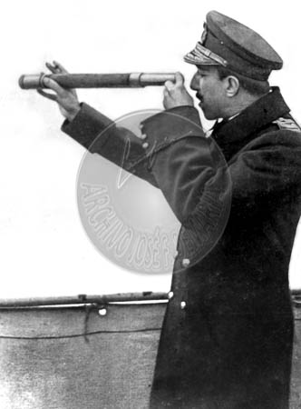 El Rey Alfonso XIII observa por un catalejo, a bordo del Jaime I a los barcos que le escoltan de regreso a España tras su viaje a Italia. Los Reyes de España a bordo del Jaime I en su regreso a España despues de la visita a Italia, con Miguel Primo de Rivera
