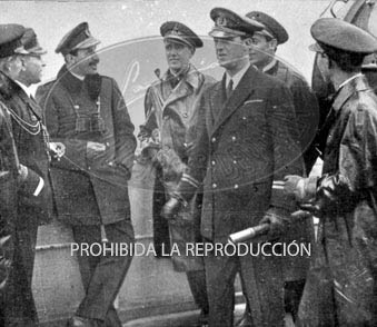El Rey Alfonso XIII observa por un catalejo, a bordo del Jaime I a los barcos que le escoltan de regreso a España tras su viaje a Italia. Los Reyes de España a bordo del Jaime I en su regreso a España despues de la visita a Italia, con Miguel Primo de Rivera
