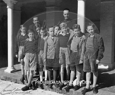 El Infante D. Juan Carlos con sus compañeros de colegio en Las Jarillas. D. Juan Carlos es fotografiado por Campúa en Las Jarillas, mientras sus compañeros observan. El Príncipe en sus habitaciones, el Príncipe en clase, el Príncipe jugando con sus compañeros.