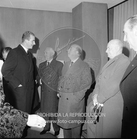 Franco, con los Príncipes de España reciben y despiden en Barajas al Rey de Grecia. Les acompañan el Ministro de Asuntos Exteriores Sr. Castiella, del Ejercito Gral. Martin Alonso, de la Gobernación Gral. Camilo Alonso Vega y del Aire Gral. Lacalle, así como el Infante D. Alfonso de Orleans.