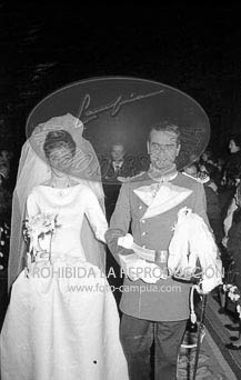 Boda de la Princesa Mª Teresa de Baviera (Tessa de Baviera) con D. Alfonso Márquez y Patiño, en San Francisco el Grande. Príncipes de España de testigos. Duquesa de Alba, Alfonso de Borbón, Gutiérrez Mellado de Coronel entre los invitados, Carrero Blanco.