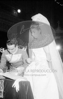 Boda de la Princesa Mª Teresa de Baviera (Tessa de Baviera) con D. Alfonso Márquez y Patiño, en San Francisco el Grande. Príncipes de España de testigos. Duquesa de Alba, Alfonso de Borbón, Gutiérrez Mellado de Coronel entre los invitados, Carrero Blanco.