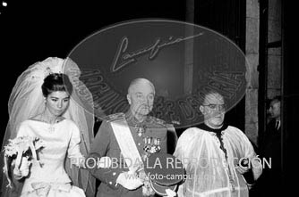 Boda de la Princesa Mª Teresa de Baviera (Tessa de Baviera) con D. Alfonso Márquez y Patiño, en San Francisco el Grande. Príncipes de España de testigos. Duquesa de Alba, Alfonso de Borbón, Gutiérrez Mellado de Coronel entre los invitados, Carrero Blanco.