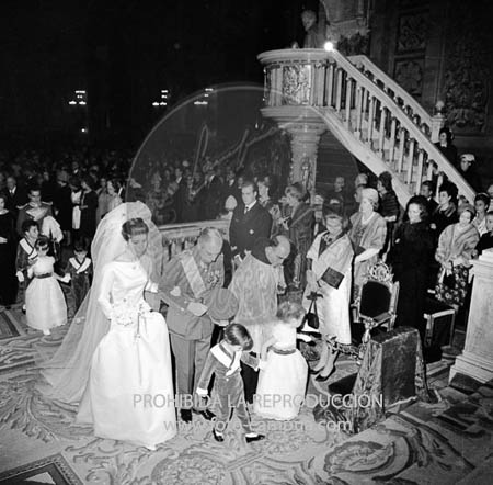 Boda de la Princesa Mª Teresa de Baviera (Tessa de Baviera) con D. Alfonso Márquez y Patiño, en San Francisco el Grande. Príncipes de España de testigos. Duquesa de Alba, Alfonso de Borbón, Gutiérrez Mellado de Coronel entre los invitados, Carrero Blanco.