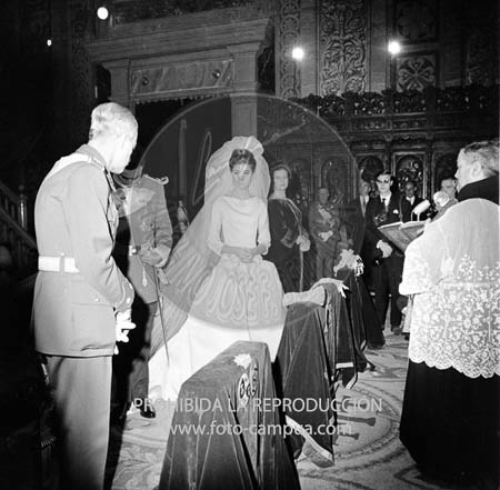 Boda de la Princesa Mª Teresa de Baviera (Tessa de Baviera) con D. Alfonso Márquez y Patiño, en San Francisco el Grande. Príncipes de España de testigos. Duquesa de Alba, Alfonso de Borbón, Gutiérrez Mellado de Coronel entre los invitados, Carrero Blanco.
