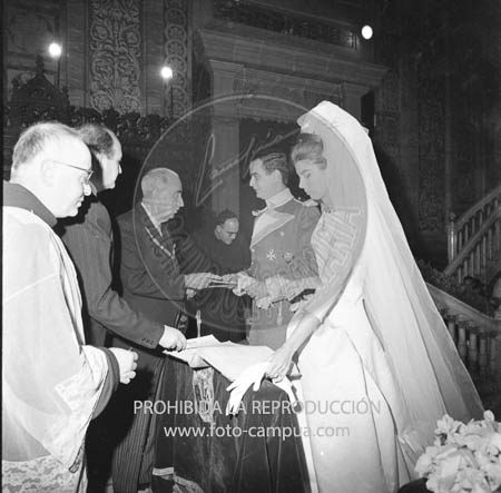 Boda de la Princesa Mª Teresa de Baviera (Tessa de Baviera) con D. Alfonso Márquez y Patiño, en San Francisco el Grande. Príncipes de España de testigos. Duquesa de Alba, Alfonso de Borbón, Gutiérrez Mellado de Coronel entre los invitados, Carrero Blanco.