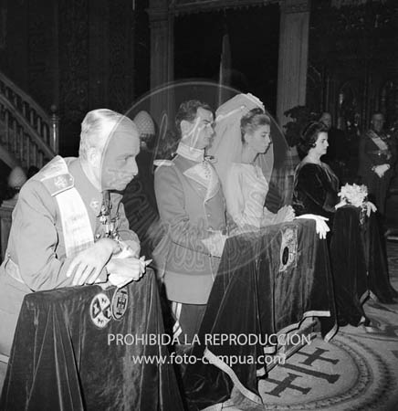 Boda de la Princesa Mª Teresa de Baviera (Tessa de Baviera) con D. Alfonso Márquez y Patiño, en San Francisco el Grande. Príncipes de España de testigos. Duquesa de Alba, Alfonso de Borbón, Gutiérrez Mellado de Coronel entre los invitados, Carrero Blanco.
