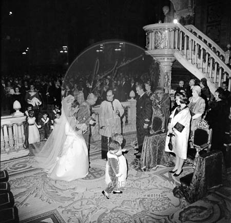 Boda de la Princesa Mª Teresa de Baviera (Tessa de Baviera) con D. Alfonso Márquez y Patiño, en San Francisco el Grande. Príncipes de España de testigos. Duquesa de Alba, Alfonso de Borbón, Gutiérrez Mellado de Coronel entre los invitados, Carrero Blanco.