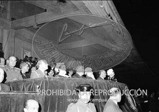 El Caudillo y los Príncipes de España presidiendo la VIII demostración sindical en el Estadio Santiago Bernabéu.