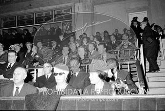 El Caudillo y los Príncipes de España presidiendo la VIII demostración sindical en el Estadio Santiago Bernabéu.