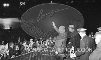 El Caudillo y los Príncipes de España presidiendo la VIII demostración sindical en el Estadio Santiago Bernabéu.