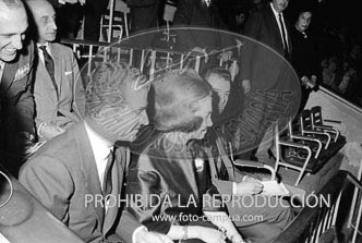 El Caudillo y los Príncipes de España presidiendo la VIII demostración sindical en el Estadio Santiago Bernabéu.