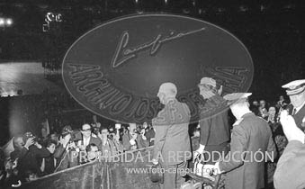 El Caudillo y los Príncipes de España presidiendo la VIII demostración sindical en el Estadio Santiago Bernabéu.