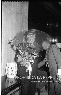 Los Príncipes de España D. Juan Carlos y Dª Sofía, con el Caudillo y su esposa, reciben al Rey Constantino de Grecia en Barajas. D. Juan Carlos besando la mano a Dª Carmen.