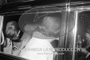 Los Príncipes de España D. Juan Carlos y Dª Sofía, con el Caudillo y su esposa, reciben al Rey Constantino de Grecia en Barajas. D. Juan Carlos besando la mano a Dª Carmen.