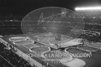 Los Príncipes de España asisten a la demostración sindical en el estadio Santiago Bernabéu, en la tribuna el Rey Simeón de Bulgaria.