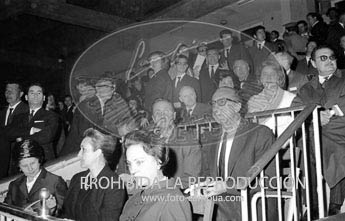 Los Príncipes de España asisten a la demostración sindical en el estadio Santiago Bernabéu, en la tribuna el Rey Simeón de Bulgaria.
