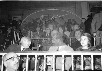 Los Príncipes de España asisten a la demostración sindical en el estadio Santiago Bernabéu, en la tribuna el Rey Simeón de Bulgaria.