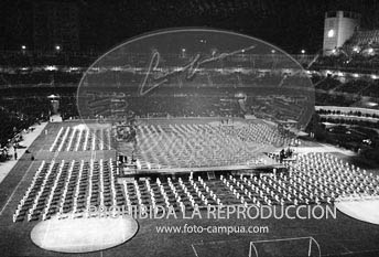 Los Príncipes de España asisten a la demostración sindical en el estadio Santiago Bernabéu, en la tribuna el Rey Simeón de Bulgaria.