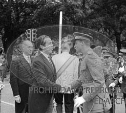 El Caudillo y los Príncipes de España en al Desfile de la Victoria. D. Alfonso de Borbón y el Rey Simeón de Bulgaria en la tribuna.