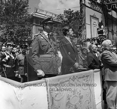 El Caudillo y los Príncipes de España en al Desfile de la Victoria. D. Alfonso de Borbón y el Rey Simeón de Bulgaria en la tribuna.