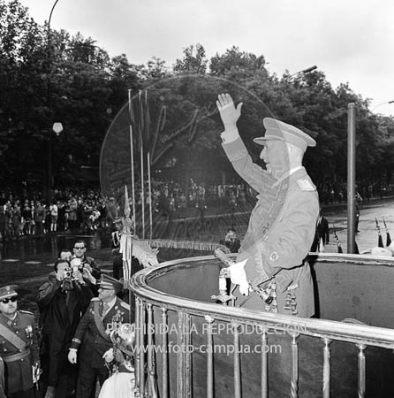 XXVII Desfile de la Victoria. El Caudillo con los Príncipes de España, el Rey Simeón y el Infante D. Alfonso de Borbón.