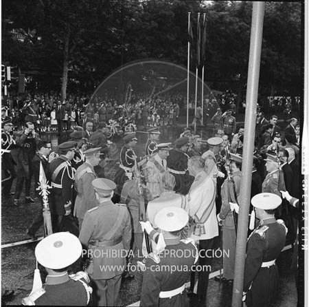 XXVII Desfile de la Victoria. El Caudillo con los Príncipes de España, el Rey Simeón y el Infante D. Alfonso de Borbón.