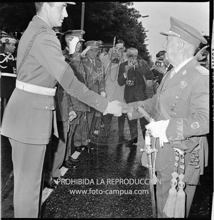 XXVII Desfile de la Victoria. El Caudillo con los Príncipes de España, el Rey Simeón y el Infante D. Alfonso de Borbón.