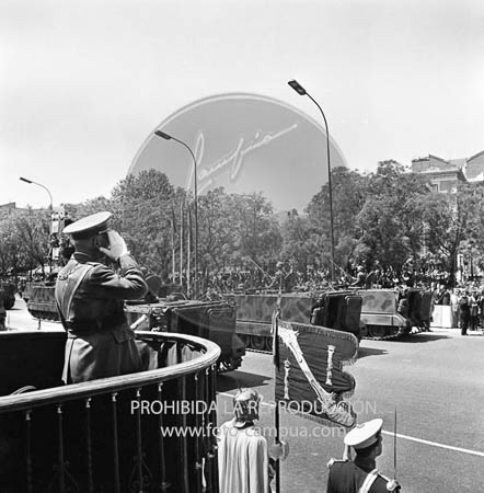 XXVI Desfile de la Victoria, preside El Caudillo con el Príncipe Juan Carlos y el Príncipe Muley Abdullah, hermano del Rey de Marruecos. En la tribuna Dª Carmen con la Princesa Sofía y el Rey Simeón de Bulgaria con el Duque de Cádiz.