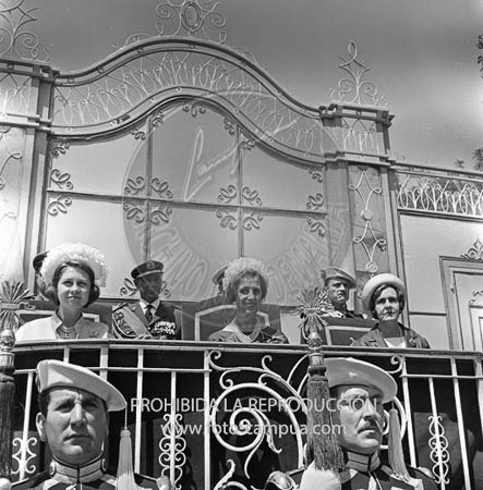 XXVI Desfile de la Victoria, preside El Caudillo con el Príncipe Juan Carlos y el Príncipe Muley Abdullah, hermano del Rey de Marruecos. En la tribuna Dª Carmen con la Princesa Sofía y el Rey Simeón de Bulgaria con el Duque de Cádiz.