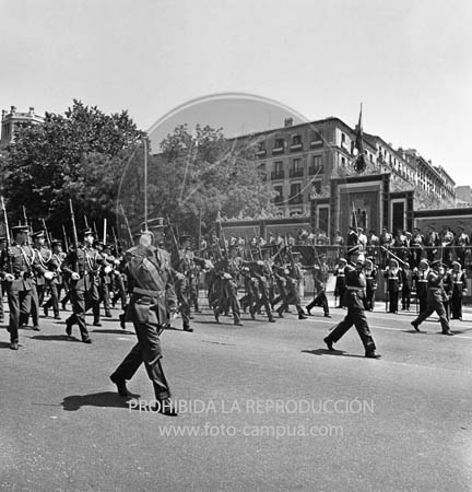 XXVI Desfile de la Victoria, preside El Caudillo con el Príncipe Juan Carlos y el Príncipe Muley Abdullah, hermano del Rey de Marruecos. En la tribuna Dª Carmen con la Princesa Sofía y el Rey Simeón de Bulgaria con el Duque de Cádiz.