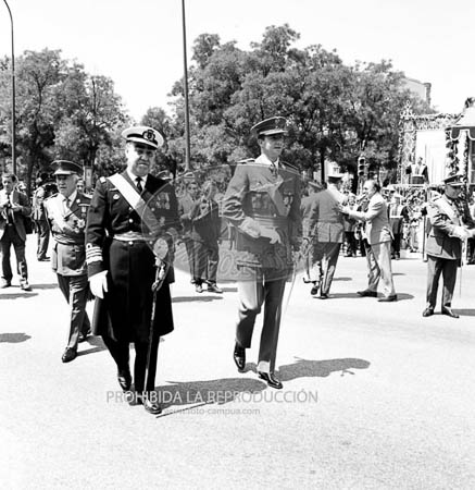 El Caudillo y el Príncipe D. Juan Carlos presiden el XXXI Desfile de la Victoria.