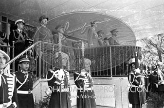 XXVIII Desfile de la Victoria presidido por el Caudillo y el Príncipe de España. El Príncipe con López Bravo.