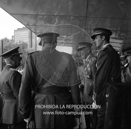 XXVIII Desfile de la Victoria presidido por el Caudillo y el Príncipe de España. El Príncipe con López Bravo.