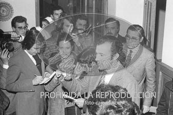 Rueda de prensa del Infante D. Alfonso de Borbón con motivo del nacimiento de su hijo en el sanatorio San Francisco de Asís. Imágenes de los pasillos del hospital, nido , periodistas esperando y visitantes. Brindando con champan, con Jaime Peñafiel.
