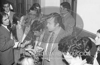 Rueda de prensa del Infante D. Alfonso de Borbón con motivo del nacimiento de su hijo en el sanatorio San Francisco de Asís. Imágenes de los pasillos del hospital, nido , periodistas esperando y visitantes. Brindando con champan, con Jaime Peñafiel.