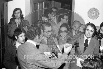 Rueda de prensa del Infante D. Alfonso de Borbón con motivo del nacimiento de su hijo en el sanatorio San Francisco de Asís. Imágenes de los pasillos del hospital, nido , periodistas esperando y visitantes. Brindando con champan, con Jaime Peñafiel.
