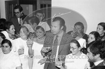 Rueda de prensa del Infante D. Alfonso de Borbón con motivo del nacimiento de su hijo en el sanatorio San Francisco de Asís. Imágenes de los pasillos del hospital, nido , periodistas esperando y visitantes. Brindando con champan, con Jaime Peñafiel.