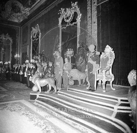 El Caudillo con el Príncipe D. Juan Carlos en el Salón del Trono del Palacio de Oriente.