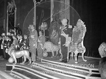 El Caudillo con el Príncipe D. Juan Carlos en el Salón del Trono del Palacio de Oriente.