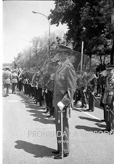 El Caudillo, acompañado del Príncipe de España, preside el XXXIII desfile de la Victoria.
