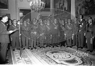 El Príncipe D. Juan Carlos acompaña al Caudillo en la recepción con motivo de la Pascua Militar