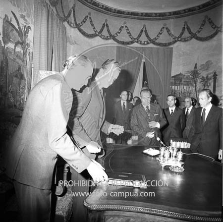 El Príncipe de España D. Juan Carlos, firma por primera vez como Jefe del Estado, por enfermedad del Caudillo, con motivo de la firma del convenio con EE.UU.