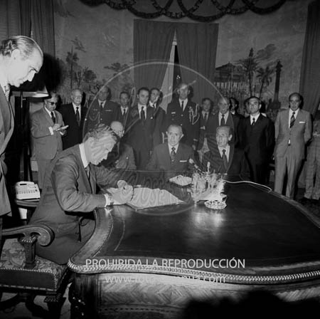 El Príncipe de España D. Juan Carlos, firma por primera vez como Jefe del Estado, por enfermedad del Caudillo, con motivo de la firma del convenio con EE.UU.
