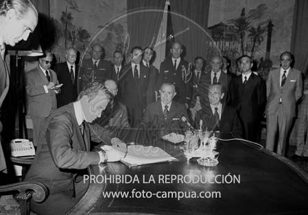 El Príncipe de España D. Juan Carlos, firma por primera vez como Jefe del Estado, por enfermedad del Caudillo, con motivo de la firma del convenio con EE.UU.