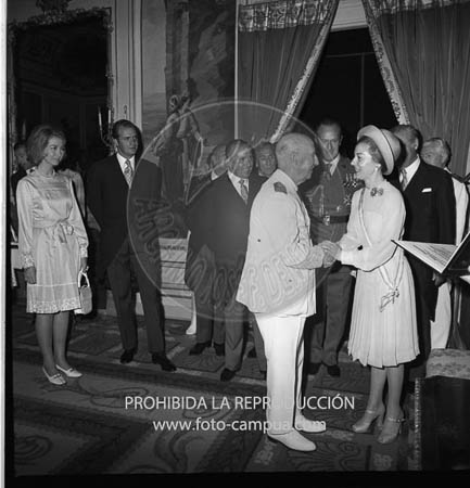 El Caudillo, acompañado de los Príncipes de España, recibe a Dª Estela Martínez de Perón, Vicepresidenta de la República Argentina, a la cual imponen la Gran Cruz de Isabel La Católica.