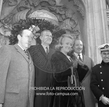 El astronauta Frank Borman deposita una corona de flores en el Monumento a Cristobal Colón de Madrid