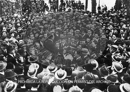 Fiesta de la Raza, 12 de octubre 1920. Concentración de estudiantes en la Plaza de Colón de Madrid, con motivo del Dia de La Raza. banderas y estandartes de las facultades y de los Exploradores de España.